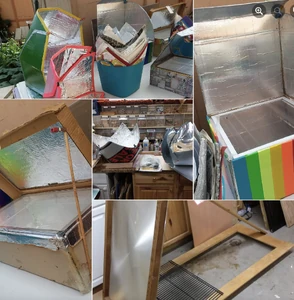 - October 2024: After years of experiments I still love making solar cookers. I'm sharing some pictures of solar cookers I have made over many years.