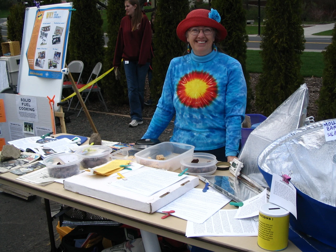2009 Accepted position heading up the SCWNet network for Canada/USA/Europe. Continuing work on the EZ-3 Solar Cooker Book, though family crises are making it take a little longer. Extended a visit to San Jose to come up with and test three new EZ-3 models that perform better farther south than the original. Sharon is trying to explore if there are ways solar cooking and solar cookers can help the growing homeless population in the USA and is doing she can to encourage and advise Malcolm Toriumi, whose Project Brightside is trying to get solar cookers out to the growing homeless population in the San Jose, CA area, many of them families with children, living in cars with no way to heat or cook food or water. Sharon returned from CA just in time to put together a solar cooking display, sample, and Information table at Washington State University's Earth Day, 4/25/09 (see photo at top).