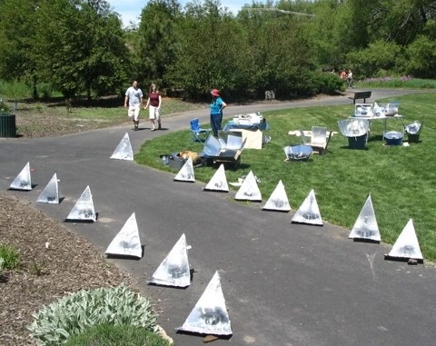 In one of her favorite projects, Sharon helped ten excited kids from a local Roots & Shoots club make EZ-3 Solar Cookers. The cookers (plus some extras for guests, plus most of Sharon's extensive collection and a borrowed Global Sun Oven, compliments of The Natural Abode) went along to the park to be incorporated into their end of the school year picnic. Participants and guests made individual pots of soup in their cookers and each member received a cookbooklet with tips and fourteen recipes for their small cookers and pots, from soup to chocolate cake. They were all excited by this new potential for summer fun, and excited to learn about how helpful solar cookers could be in many parts of the developing world, and how much they could help the environment.
