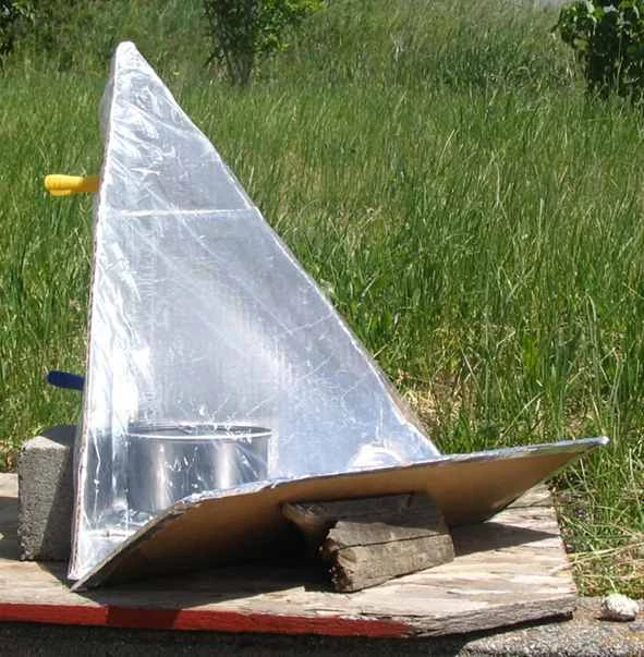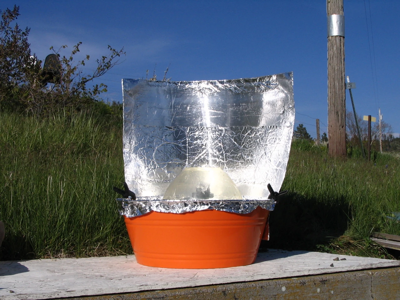 July 2009: Writer and avid solar cook Sharon Cousins helped kids make her “EZ-3” solar cookers as part of a Roots & Shoots club project at Lena Whitmore School in Moscow, Idaho. The students used the cookers to make individual pots of soup at their year-end school picnic. Cousins says the students are “all excited by this new potential for summer fun, as well as excited to learn about what a help solar cookers can be in many parts of the developing world, and how much they can help the environment.” The EZ-3, shown with additional front reflector, is completely enclosed in a transparent, heat-resistant bag Cousins says the EZ-3 cooker, which is similar to the Pyramid cooker that ClearDome Solar Thermal used to produce, is an “ideal cooker for youth projects, as it is easy to make, is easy to aim using the shadow, and it works well.”