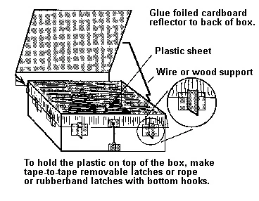- A solar "window" made of glass or plastic film over the top of the box.