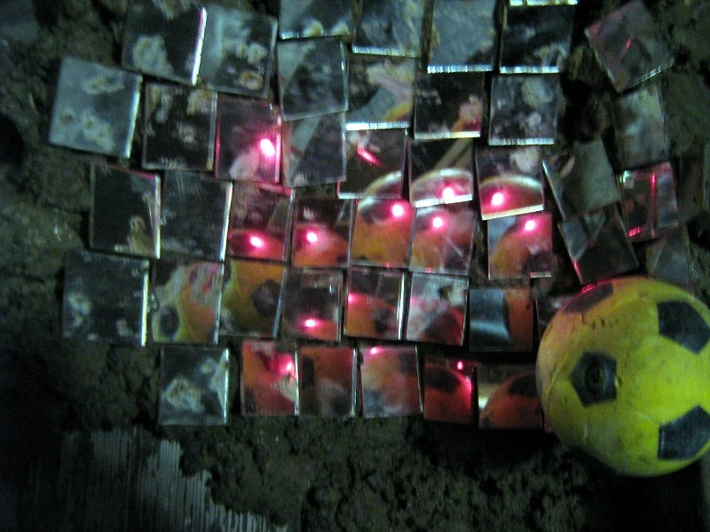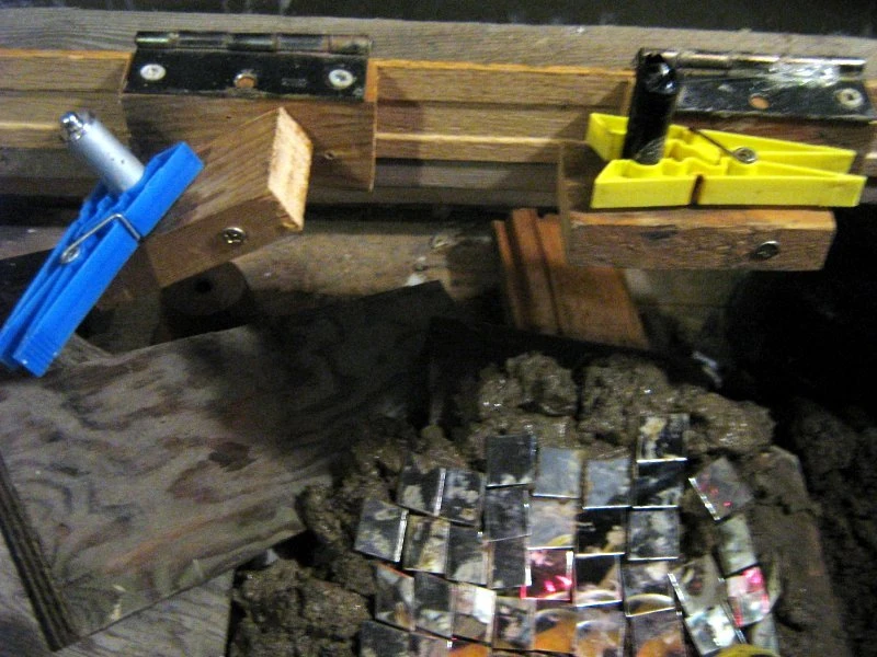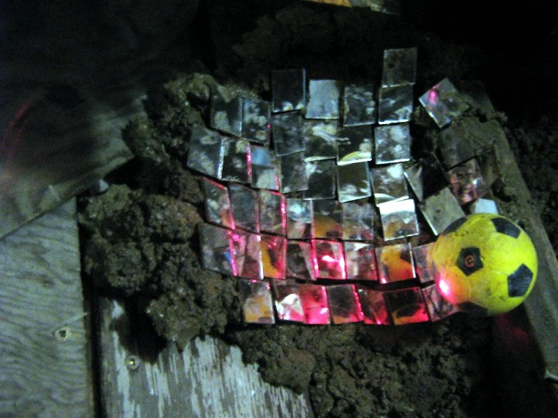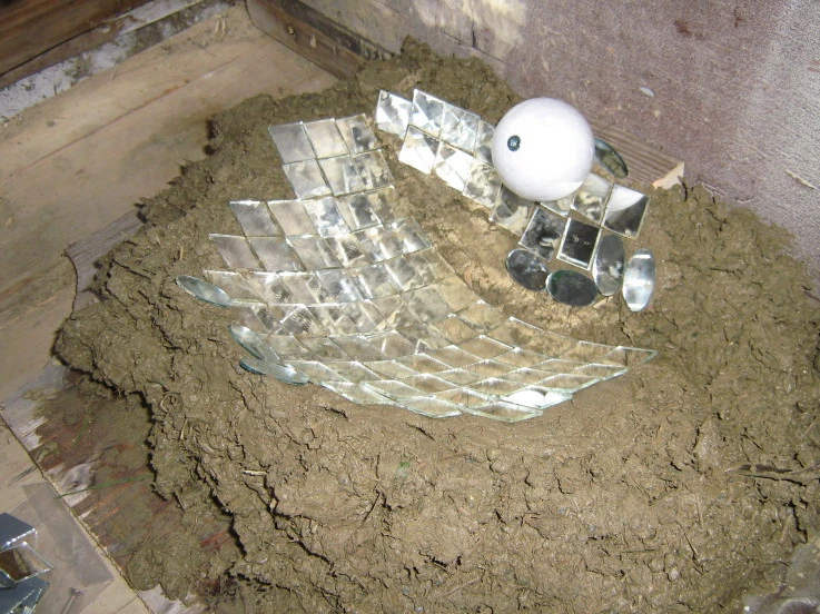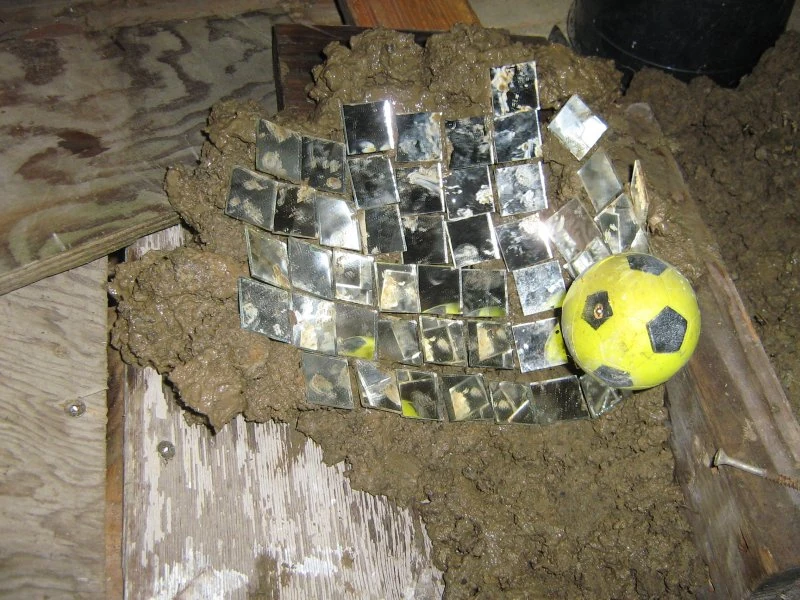 I have used the solar design t square to get the clam shape shown in the following pictures. The little mirrors are adjusted so that the light from each laser pointer hits the mirror and bounces to hit the target ball. I used clay underneath the mirrors to hold and adjust them.