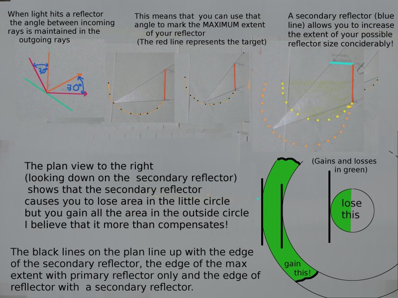 This means that you can use 2 laser pointers to represent the sun. One is for the sun at the START of the cook time and the other is to represent the sun at the END of the cook time. If you mount the laser pointers on a slider on a T-square, above your model, you can use them to test how the light rays bounce off of every part of your model! (something that you cannot do with sunlight itself because it hits every part of the reflector at once!) This means you adjust your model a little at a time, like claymation, until you get the desired result. Therefore you can make much better models of your new solar cooker reflectors and use the laser pointers to see where the light ends up after hitting the reflector. If the light bounces from your reflector and misses the target, it is a relatively easy task to adjust the reflector so that it hits its target.