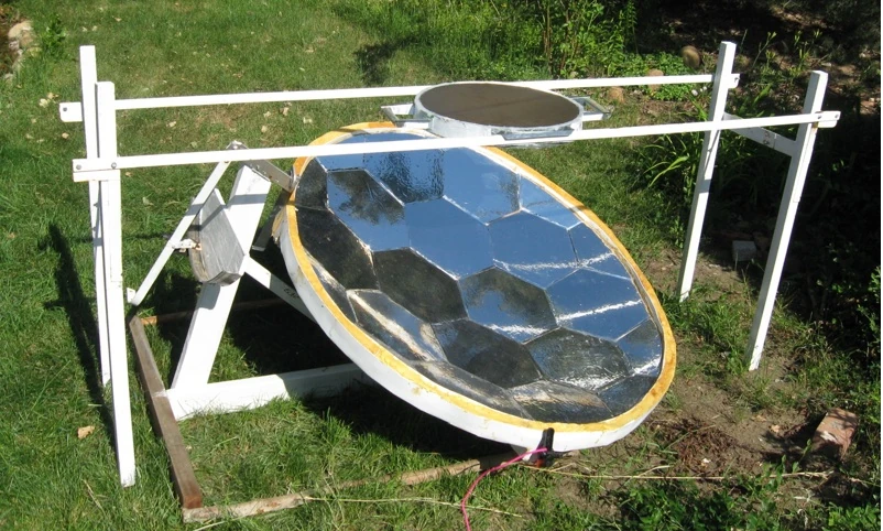 The mirror consists of flat hexagonal panels of aluminized Mylar inside of a parabolic framework. The flat panels uniformly illuminate (evenly heat) the bottom of the frying pan, which sits above the mirror. The flat panels make this mirror safe to use for cooking because they don’t ever concentrate the sun in just one place, which can burn the cooks or start fires. The pan bottom is coated with a special black surface that only emits very low levels of radiation. The black surface keeps the fryer from losing as much as half the power it gets from the sun. The pan’s nonstick surface is made from anodized aluminum whose pores are filled with cooking oil.