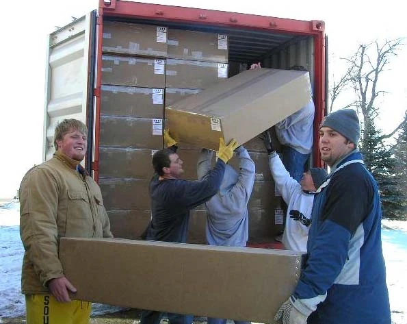 Five South Dakota State University football players volunteered to load the sea container with 1000 unassembled solar box cookers destined for Haiti.