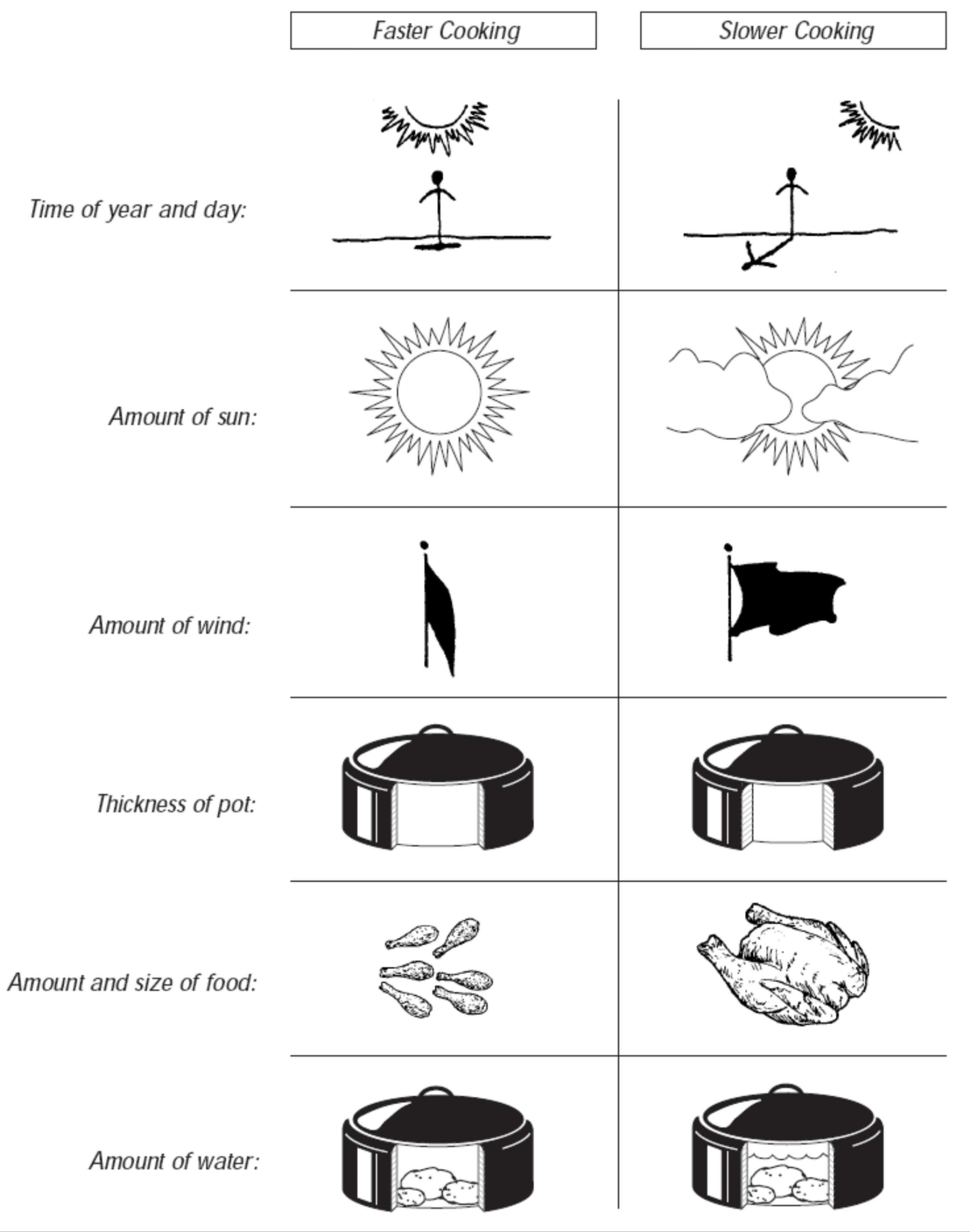 As a rule of thumb, you can figure that food in a panel cooker like the CooKit or a single-reflector box cooker will take about twice as long as in a conventional oven. However, when the time required to obtain fuelwood and tend the fire is considered, solar ovens usually demand less of the cook’s time. Also, since your food very seldom burns in a box cooker or panel cooker, you don't have to watch the cooker or stir any food as it cooks.