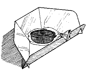 In this design, various flat panels concentrate the sun's rays onto a pot inside a plastic bag or under a glass bowl. The advantage of this design is that they can be built in an hour or so for next to no expense. |