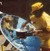 Cooking with a parabolic cooker is very similar to cooking on one burner of a conventional stove. Since the concentrated sunlight shines directly on the bottom of a pot, the pot heats up and cooks very quickly. The food can burn though, so you have to stir it and watch it carefully.