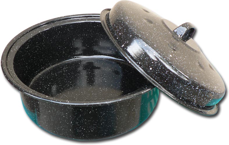 Ideally, you want to use a dark, lightweight, shallow pot that is slightly larger than the food you will cook in it. Metal pans seem to cook best. Hardware stores in the USA usually carry dark, speckled, As of 4/27/23, the 3 qt. Granite Ware covered pot is available on Amazon again. Shiny aluminum pots--so common in developing countries--can be painted black or can be blackened in a fire. Cast iron pots will work very well on a good day when you start cooking early, but extra solar energy is used to heat up the pot as well as the food, so they will not work in marginal conditions. Some of the newer backpacking pots and pans are black inside and out (or the pot is black and only the top of the lid needs to be painted), have tight lids, and work very well in solar cookers. Also, note that you can cook in clear pots and jars with lids.