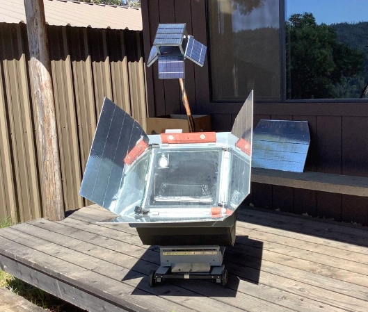 - February 2025: Tracking solar cooker project is finalist - Brian White has been notified by Autodesk Instructables his solar tracking device has made it to the final round of judging in the annual competion. He explains his low-tech design is aimed at gardeners, which he refers to as an untapped market. It can be used for sterilizing potting soil and processing weeds and vegetation. They go straight to good mulch in a single day without needing a compost heap. His goal was to simplify the tracking approach traditionally used with Scheffler Community Kitchen systems. Read his submission...