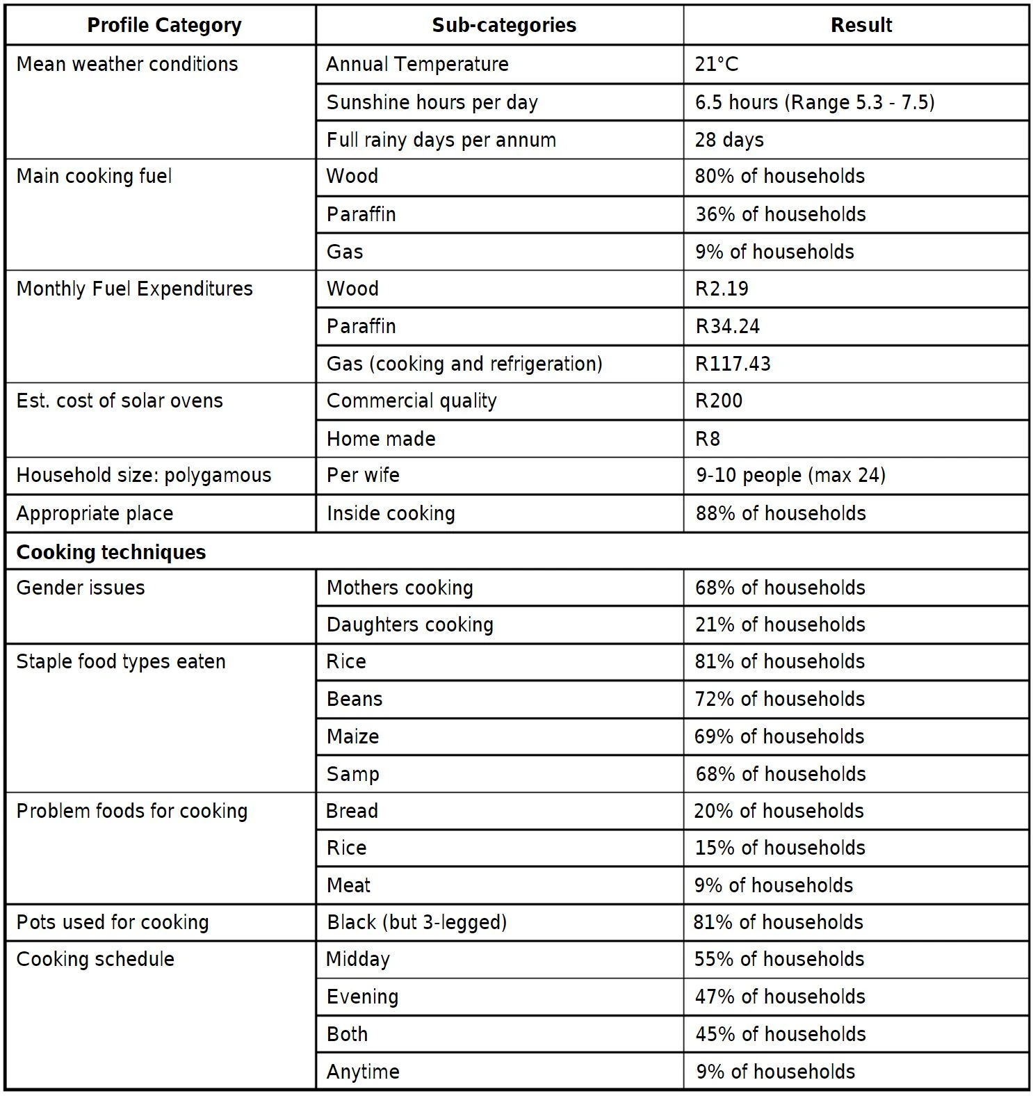 A description with considerable detail on this work was presented at the Kimberly world conference in 2000. Their study allowed them to arrive at a number of conclusions. Solar cooking is clearly feasible in this part of South Africa and could ease the burden of fuel collection for women. However, attention must be paid to gender issues, aimed at reducing the substantial inequities. The report ends with a description of their plan to proceed, including local hosting committees, microfinance or revolving credit schemes, and development of income-generating activities utilizing solar ovens.