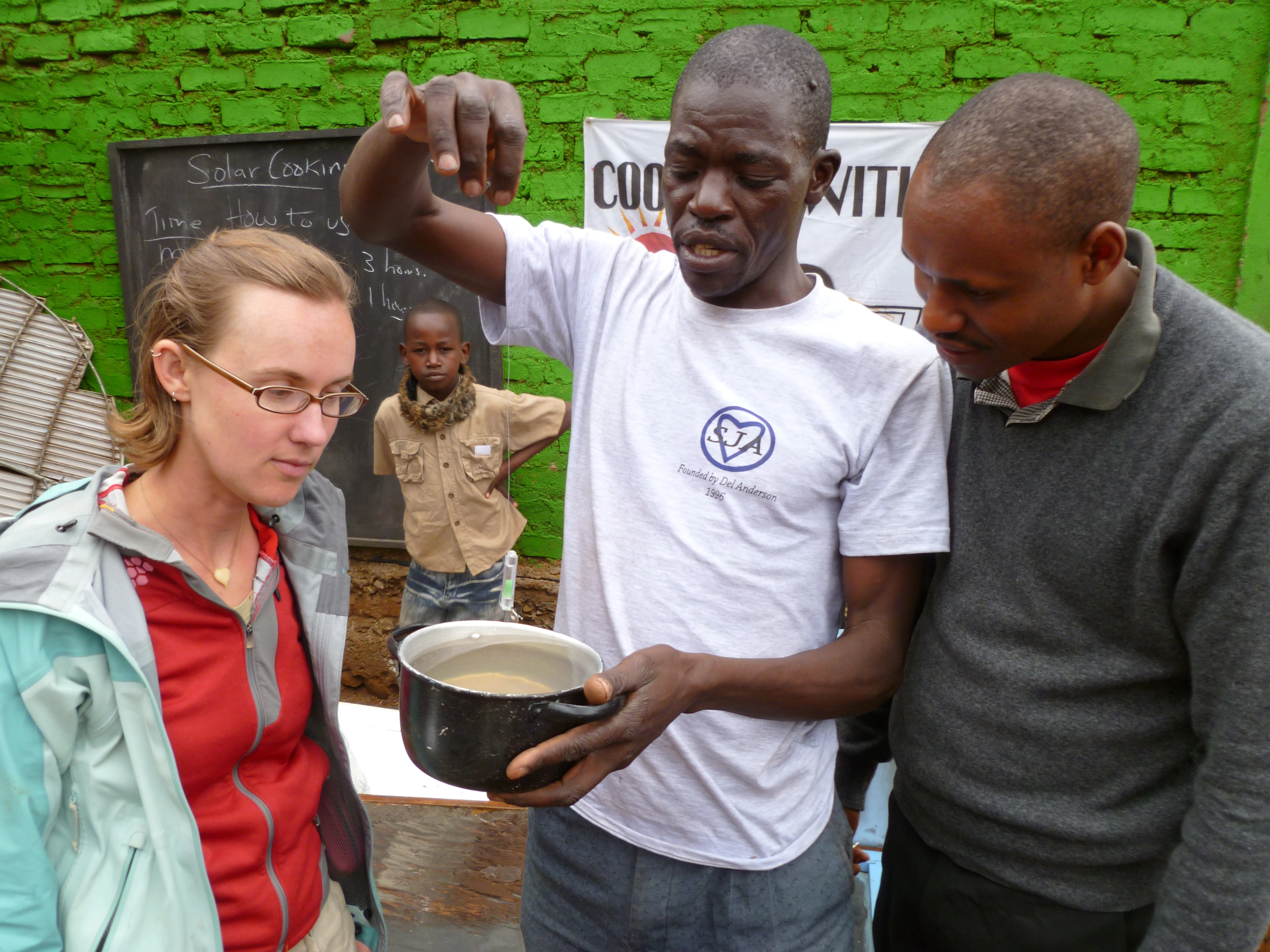 - August 2011: Spirit in Action visits Sun Cookers International in Eldoret Kenya . Boyd Cothran (Spirit in Action Board member) and Tanya Cothran (SIA Executive Administrator) recently visited the storefront of Sun Cookers International. Camily Wedende gave us a presentation, using his on-site chalkboard, about how to use WAPI s to know when water is pasteurized and safe to drink. People gathered around us to watch the presentation and ask questions about the cookers. Wedende’s business is to construct and sell solar cookers, and to train people about their value. He sells cookers to local colleges, churches and individuals. While visiting, we also had the chance to review Wedende’s marketing strategy and give him tips about how to increase public awareness about solar cookers. Please watch our photo essay about our visit.