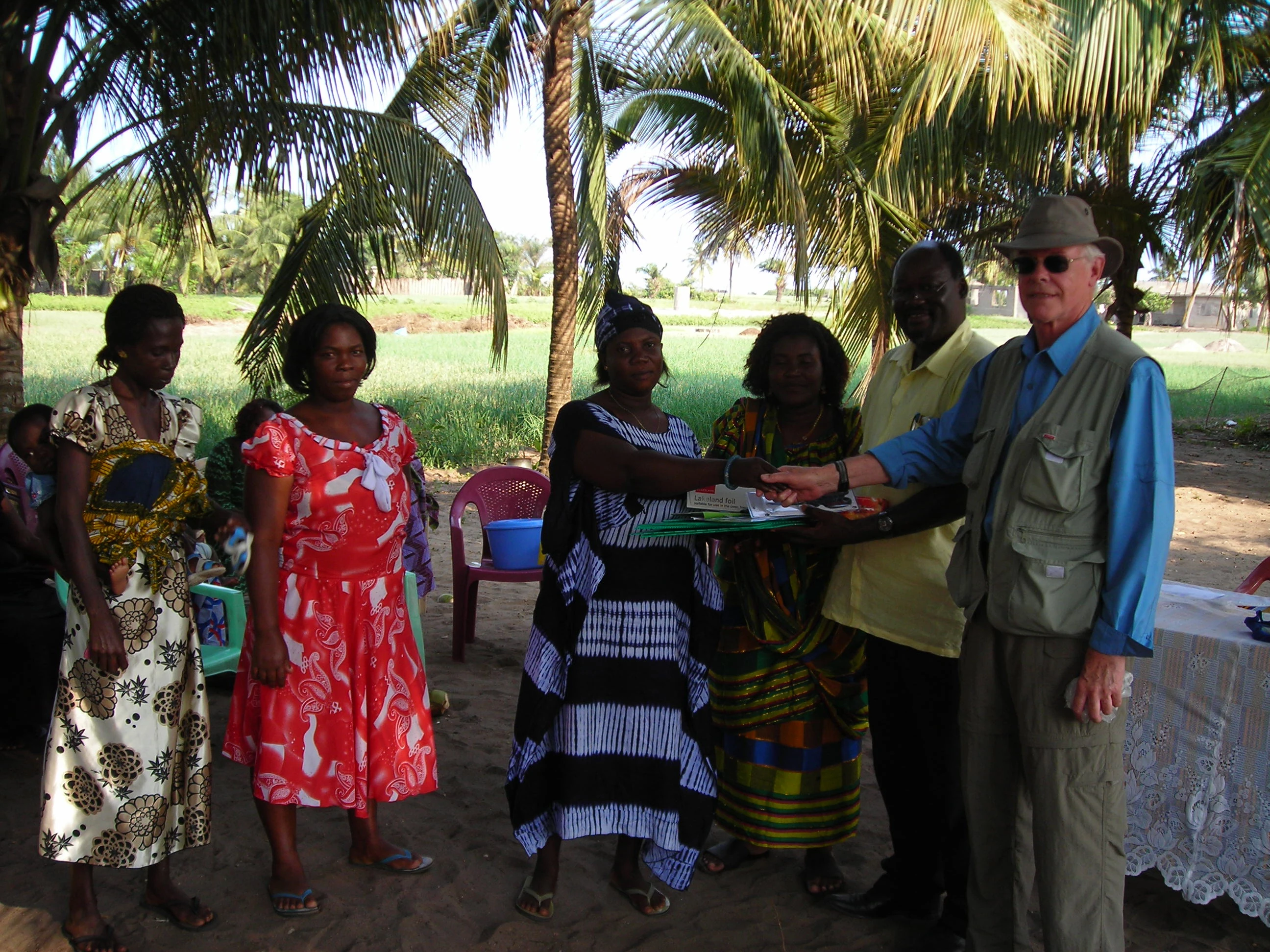 Stephen Pearson presenting an "Oven Mistress" kit (including plastic templates, plans, instructions, razor knife, scissors) to the lady selected by her nearby village.