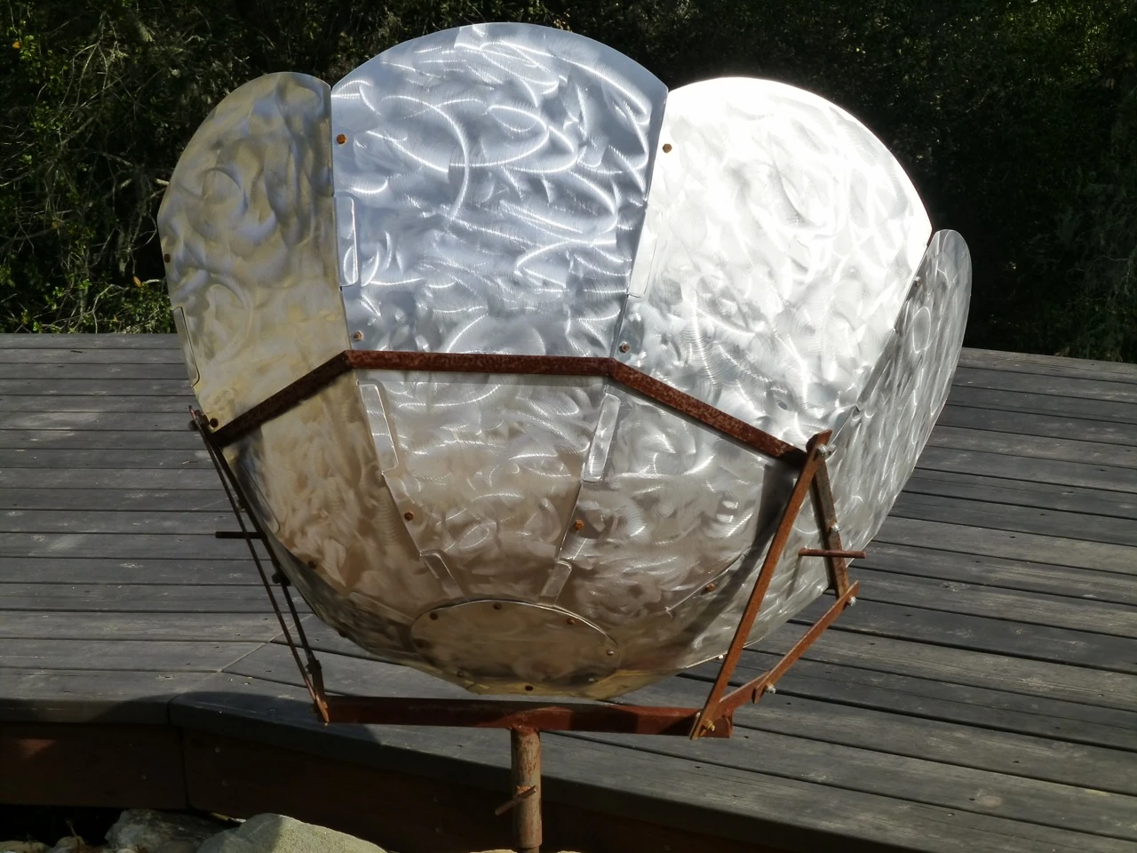 The Sunflower Solar Cooker is a diffuse focusing parabolic solar cooker designed and built by John Tyler. The cooker is adjustable both for time of day, as it rotates on the rod that is mounted into the ground, and for the time of year as the inclination angle is adjustable. This is designed around a trapezoid with all four corners pivoting.