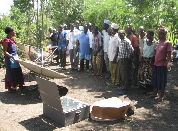 - March 2013: John Amayo, with SURE, reports that the Ministry of Agriculture in Kenya recently held a farmers field day, providing an event for local farmers to come and see new ideas. SURE participated, and were able to demonstrate solar cooking using the CooKit, a parabolic solar cooker, and a Pulsee Solar Cooker. The farmers were pleased with the meat stew prepared in the box cooker, the roasted meat on the parabolic, and water pasteurization with the Pulsee. We also used the heat retention basket on this particularly windy day. It was rewarding to be able to show how the water available was not safe for drinking, and how solar water pasteurization can make it safe.