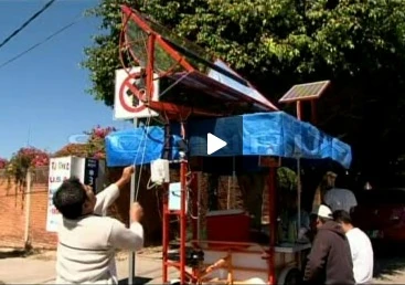 Alfredo García instaló un reflector cilindro parabólico en su puesto ambulante para calentar el consomé y los tacos que venden en las calles de Oaxaca. Además del ahorro que representa el no utilizar gas, otro de los beneficios de este sistema es que la comida resulta menos grasosa.