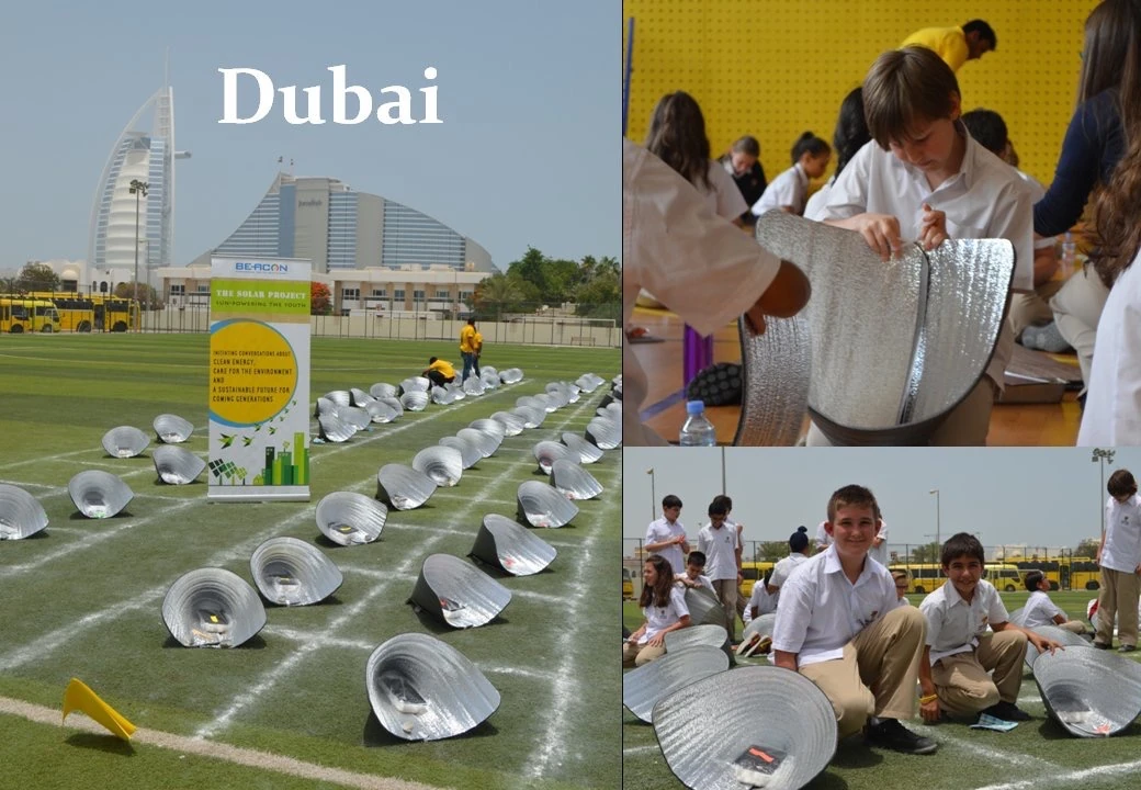 - June 2015: Dubai students learn to use solar reflectors to cook in the sun - Inspired by the Guinness World Record setting event held in Mumbai, India, earlier this year, Beacon Energy Solutions partnered with DPS Academy in Dubai, United Arab Emirates, to "inspire youngsters to harness ... solar energy." Sixty-seven students from grades 5 - 8 gathered to learn how to use a solar oven to cook several types of local dishes.