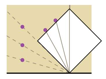 Line up your origami "protractor" so that its bottom right-hand corner (from whence issues the fan of 15° creases) fits into the angle formed by the 25 cm line and the adjacent side of the cardboard piece. Now use your marking tool to place a dot on the cardboard where each crease meets the left-hand side of your "protractor".