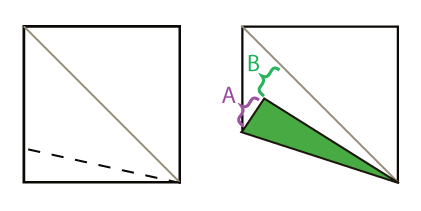 Valley fold the lower edge towards the crease in the middle. The object is to make a fold such as the distances marked "A" and "B" in the illustration are equal.