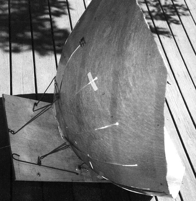 He proposes an ellipsoidal shape reflector, that can be set at an angle to catch the sun for a longer period of time between adjustments. The shape catches the sun's curved path in the sky. The elliptical shape redirects less focused light on the cooker resulting in lower cooking temperatures.